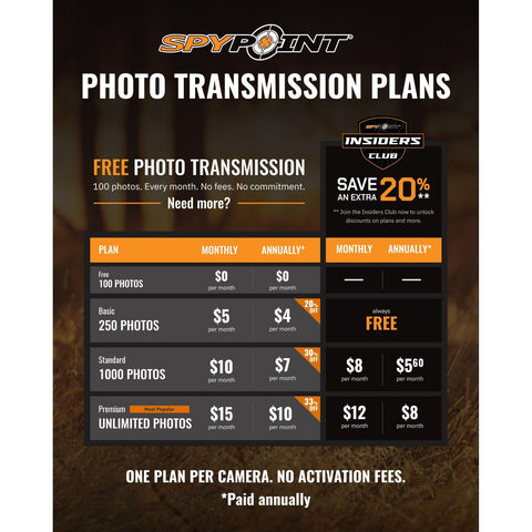 - Enjoy SPYPOINT's FREE PHOTO TRANSMISSION PLAN! Transmit up to 100 photos per month with no fees and no commitmentโit's the only free plan for cellular cameras. Need more? Paid plans start at $5/month for 250 photos or $15/month for unlimited. Choose monthly or annual billing with no activation fees. One plan per camera. Plus, join the Insiders Club for extra savings!
