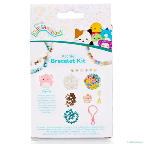 Details: Discover your special talent for jewelry-making with the Original Squishmallows Archie the Axolotl Bracelet Kit! Packed with hundreds of beads in Archie’s favorite colors and plenty of cording, you can create custom bracelets to stack or trade. String up fun patterns with various pink, yellow, and iridescent beads, then add the metallic alphabet beads that spell SQUISH for a dash of playfulness — don’t forget to incorporate the Archie charm to show off your ’Mallow pride! Ideal for all skill levels, this kit comes with a fun project guide that’ll ensure your designs are a hit whether you are scoring on the soccer field or simply hanging with your friends! And with a bonus Archie keychain to accessorize anything from backpacks to purses and gym bags, you can Squad Up wherever you go! This kit makes the perfect gift set — tuck it in an Easter basket, Valentine's Day gift bag, or give it to a jewelry-loving friend. Recommend for Squishmallows fans age 6 and up — let the adventure begin, one accessory at a time!