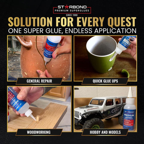 - ✅ FAST AND STRONG: Starbond "Multi-Purpose" Medium CA Glue is engineered for quick, strong, and user-friendly performance. With a 10-15 second set time, it strikes the perfect balance—fast enough to keep projects moving, yet slow enough to allow repositioning and precise adjustments.