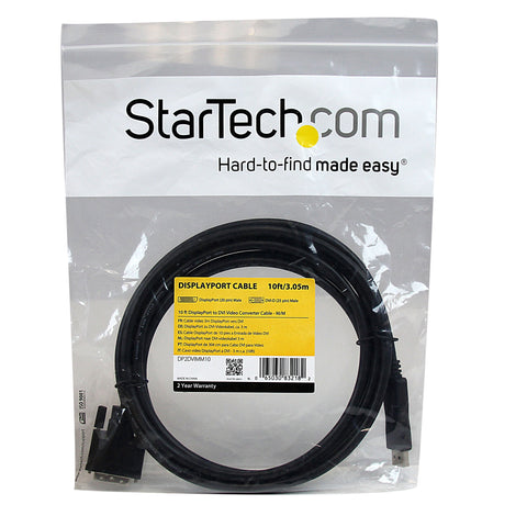 Details: The DP2DVIMM10 DisplayPort to DVI (M-M) Video Converter Cable lets you connect a DVI capable display to a DisplayPort video card/source using a single cable. The cable provides a connection distance of 10ft and features a male DVI connector and a male DisplayPort connector. The DisplayPort/DVI video converter cable supports high bandwidth video transmissions, easily delivering monitor resolutions up to 1920x1200 or HDTV resolutions up to 1080p - allowing you to take full advantage of your DVI capable display, while using a cutting edge DisplayPort video source. DP2DVIMM10 is a passive adapter cable that requires a DP++ port (DisplayPort++), meaning that DVI and HDMI signals can also be passed through the port. Backed by a StarTech..
