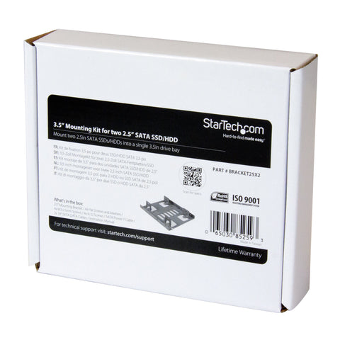Details: The 2.5" to 3.5" HDD bracket for SATA hard drives lets you install two 2.5in SATA hard drives (HDD) or solid state drives (SSD) into a single 3.5in mounting bay enabling you to significantly increase the performance of your desktop by adding the speed of a 2.5in SSD. Maximize the internal mounting space of your computer with this 2-drive SATA HDD/SSD mounting bracket, by installing two 2.5in hard drives in the same 3.5in bay. The 2.5" to 3.5" hard drive mounting bracket can be used with SATA hard drives and solid states. For a hassle-free installation, the dual SATA HDD/SSD mounting bracket includes all required data and power cabling for both SATA drives. Plus, the dual hard drive mounting bracket kit can support IDE drives when using our 2.5in to 3.5in IDE Hard Drive cable adapter (IDE4044). The dual hard drive 2.5" to 3.5" HDD bracket for SATA hard drive features solid steel construction and is backed by a StarTech..