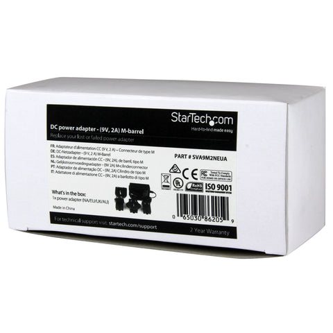 Details: This replacement power adapter can provide a power source for any electronic device with an M-type barrel requiring up to 9 volts and 2 amps of power. Replace your failed or lost power adapter The adapter is a perfect replacement for the lost or damaged power adapter you've used to power your existing electronics. Keep a spare power adapter on hand When downtime isn't an option, keeping spare power adapters on hand ensures that you won't be left waiting for a replacement to arrive or have to replace your devices just for the sake of a compatible power source. The ideal travel power adapter For frequent travelers, this power adapter saves you from buying multiple adapters. To ensure it will work in your region and the region you're traveling to, the power adapter features 100-240V automatic switching and regional clips for North America, Europe, United Kingdom and Australia. The SVA9M2NEUA is backed by a StarTech..