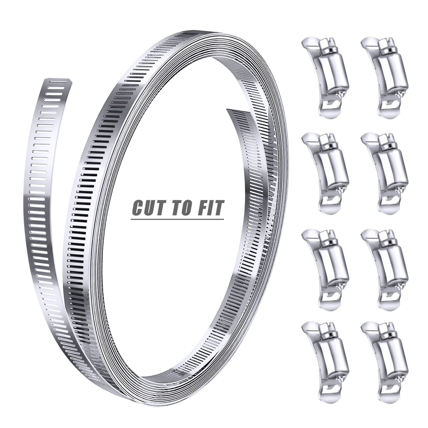 - Hose Clamp Kit Package: 12 Feet metal strap roll + 8 fasteners + 1 instruction manual