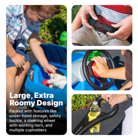 - SAFE & FUN: Easy-latch adjustable seat belt for safety, real car horn and steering wheel, convenient cup holders, under-hood storage for snacks and toys.
