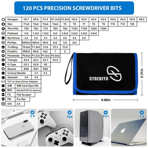 - 【Wide Application】This precision screwdriver set has 120 bits, complete with every driver bit you’ll need to tackle any repair or DIY project. In addition, this repair kit has 22 practical accessories, such as magnetizer, magnetic mat, ESD tweezers, suction cup, spudger, cleaning brush, etc. Whether you're a professional or a amateur, this toolkit has what you need to repair all cell phone, computer, laptops, SSD, iPad, game consoles, tablets, glasses, HVAC, sewing machine, etc