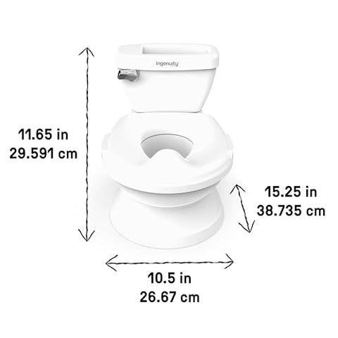 Details: Potty training is easier (and more fun) with the #1 Ingenuity My Size Potty Pro*. Designed by the #1 Manufacturer of Potties* to look and feel like a real adult toilet, the original My Size Potty Pro is a top-rated toddler floor potty that helps to ensure a comfortable and confident progression to the real thing. Named the Best Potty Training Toilet in the 2023 Best of the Bump Awards, this toilet features a chrome-style toddler potty handle that makes a realistic flushing sound to reward your little one for a job well done. A removable potty topper can be used as a toddler toilet seat on an adult toilet to help your toddler become a potty training pro. A built-in storage compartment is spacious enough to hold books, a tablet, wipes, or anything else your little one needs to promote healthy habits during the potty training process. With a removable bowl and integrated splash guard, the My Size Potty Pro is easy to clean – perfect for all of toilet training’s messy moments. The assembled dimensions are 10.5 x 15.25 x 11.65 inches. Incudes 2 AAA batteries. For children ages 18 months and up, with maximum weight of 50 pounds. (*Circana, Retail Tracking Service, Potty Training, U.S. dollar sales, January 2024-December 2024 combined)
