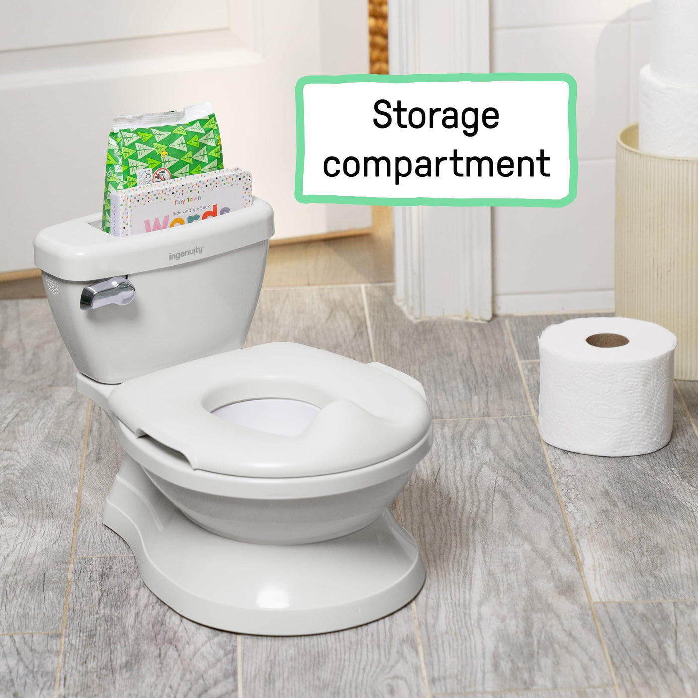 - A convenient built-in storage compartment within the tank gives you and your kids the sanitary space to hold potty training essentials like books, wipes, and more