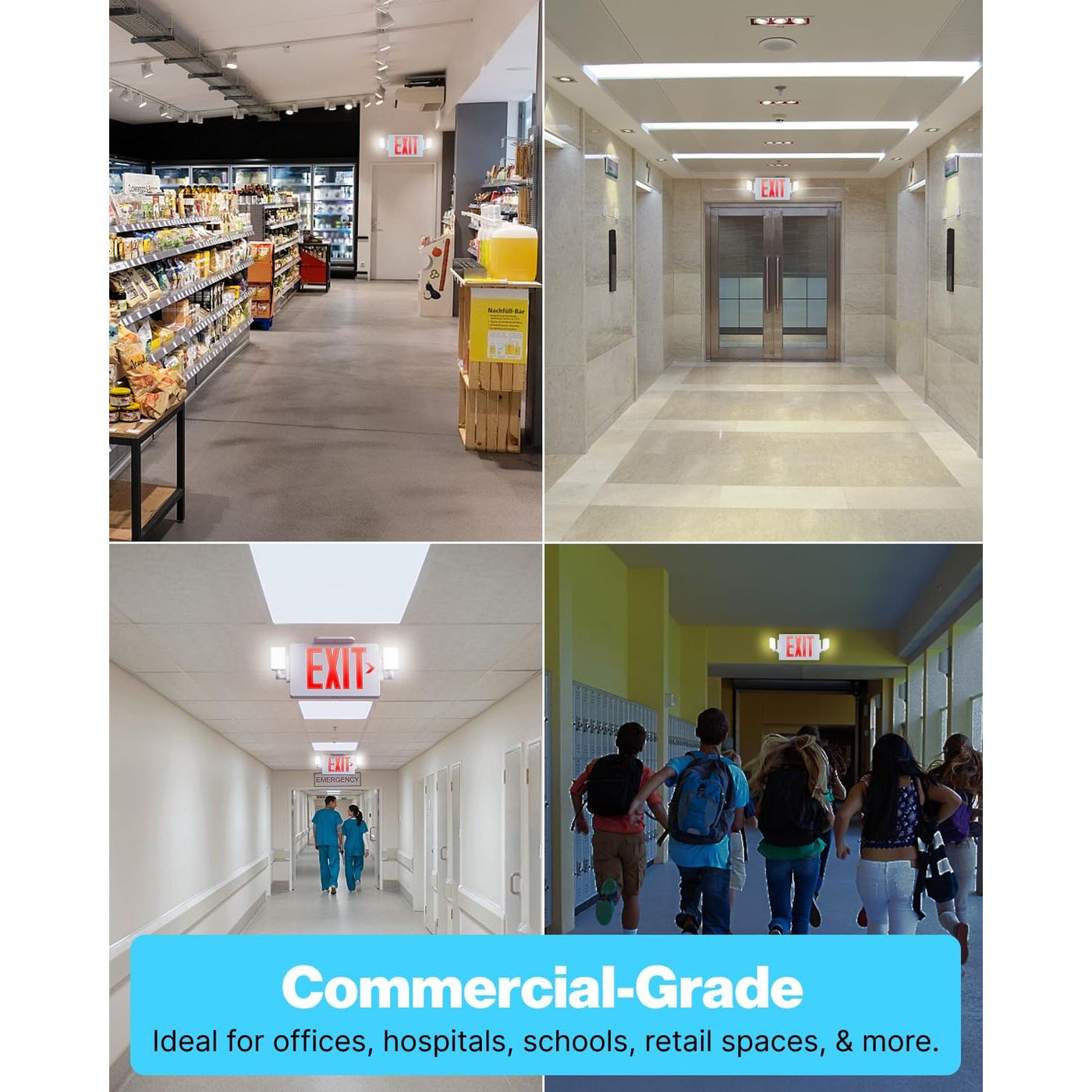 - COMMERCIAL GRADE - Our emergency exit sign is designed for safety needs at offices, schools, retail spaces, and everything in between. Specifications: 120-277V, Test Switch, Backup Battery, ABS Fire Resistant Plastic, Double Sided, Dual Mounting. Certifications: UL Listed.