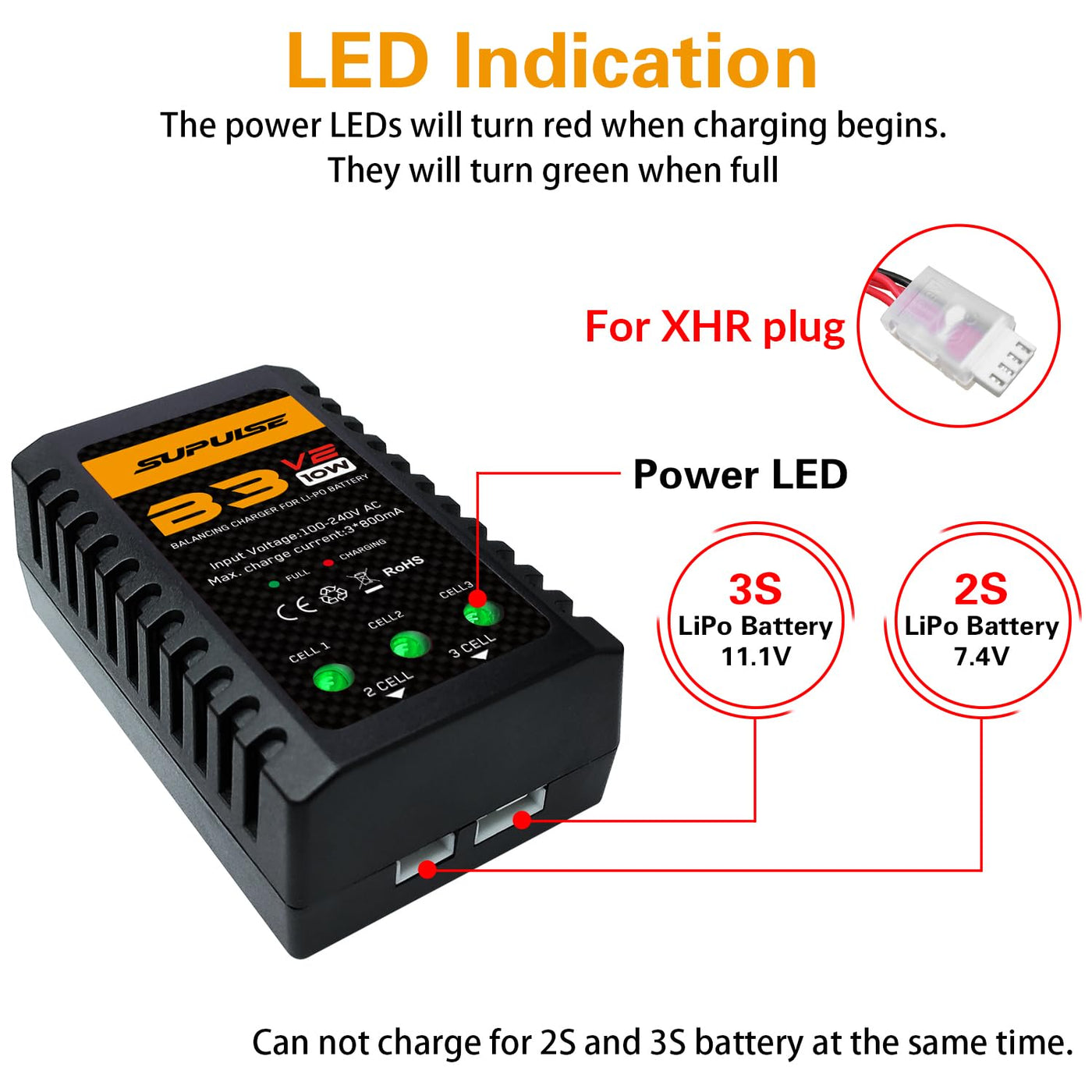 SUPULSE LiPo Battery Charger 2S-3S RC Balance Charger AC 7.4-11.1V 10W Upgrade Version Compact Lipo Charger for XHR Plug Battery(B3V2)