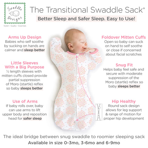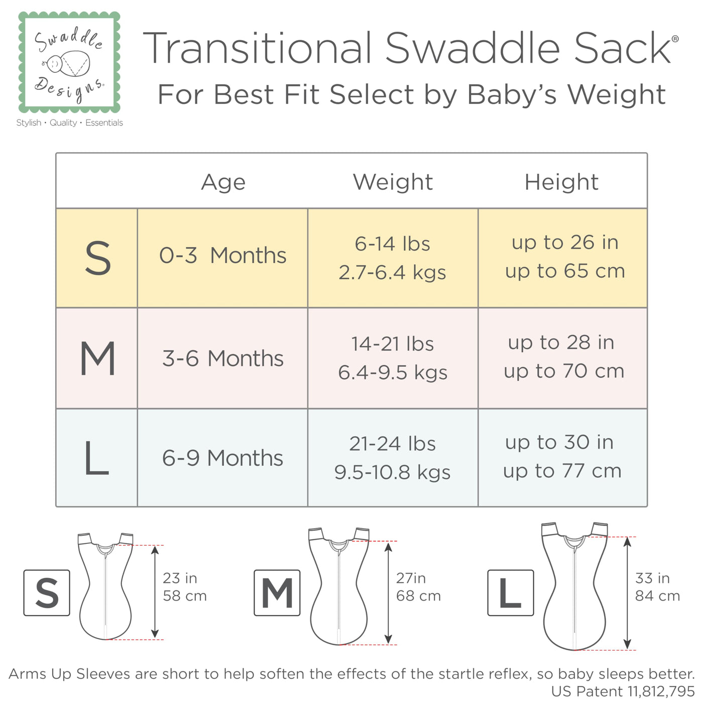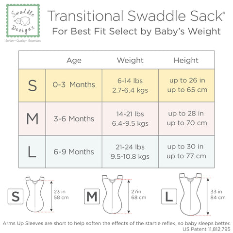 Details: The transitional swaddle Sack is designed to bridge the gap from swaddling to sleeping sack. When baby is ready to transition from a swaddle, but not ready for a sleeveless wearable blanket. The transitional swaddle Sack is perfect for babies who prefer to sleep with arms up. The transitional swaddle Sack supports baby in a back sleeping position and allows for multiple arm and hand positions to help baby sleep better. The transitional swaddle Sack with partial suppression of the Moro (startle) reflex, and the arms up sleeve design is a safer sleep solution. If baby rolls over, the design allows baby to use their arms to lift their torso and reposition his or her head to get access to air. The transitional swaddle Sack uniquely shaped arms up 1/2 Length sleeves are not full length, so baby's arms will be close to body when mitten cuffs are closed for swaddle snugness. The patent pending sleeve design are not full length "by design." When the mitten cuffs are closed and baby is placed in the Swaddle Sack, The uniquely shaped arms up design positions baby's in a flexed, close-to-body, arms-up position, and shape and length of the sleeve helps partially suppress the startle reflex. Parents are encouraged to close the cuffs first, and then place baby in the sack. If the caregiver wants to allow baby to suck directly on hands, then open one or both of the mitten cuffs. The 2-way zipper makes the Swaddle Sack easy to use for the caregiver. The zipper has two zipper pulls - one at the neckline and one at the foot of the sack. Winner of multiple awards. Recognized by the International Hip Dysplasia Institute. The lower section is less spacious than a typical sleeping sack, and in turn, the transitional swaddle Sack provides some suppression of the startle reflex for the legs. The hip healthy design allows baby's knees and hips to flex. Premium cotton. Made from premium, interlock Cotton knit. Machine washable. Swaddle Sack is a registered trademark. Patent pending.