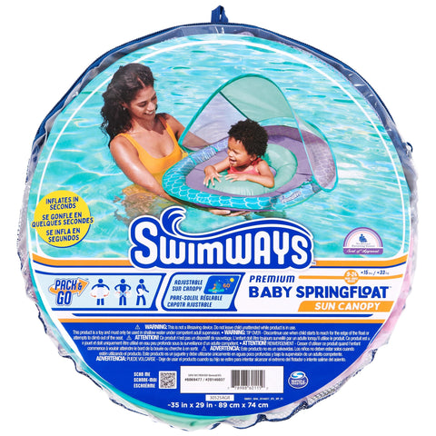Details: Introduce your baby to the water with the SwimWays Baby Spring Float Sun Canopy! This baby floaty features a soft mesh seat with secure leg holes so baby can kick freely underwater as well as a mesh play space so your little one can splash and play with pool and water toys. The new and exclusive Hyper-Flate Valve features extremely innovative and convenient technology that enables parents to inflate the float approximately three times faster than before. Designed to provide a more comfortable and secure water introduction experience, the SwimWays Baby Spring Float has a patented inner spring sewn into the float along the edge of the outermost inflation chamber, providing increased stability. The removable sun canopy offers a shady spot from the sun, and the mesh sides of the canopy allow you to maintain eye contact with your baby at every angle, so you never miss a smile or giggle. The Baby Spring Float folds flat into 3 compact circles and includes a reusable carry bag, making it a great choice for travel or trips to the neighborhood pool. This float measures 34"L x 30"W x 20.5"H when inflated, and is recommended for babies aged 9-24 months.