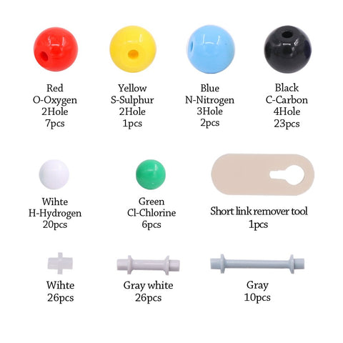- ★ POWERFUL FUNCTIONS --- This Molecular Model Kit has a total of 122 pieces including short link remover tool. Super easy to build models for organic and inorganic chemistry, This model contains C, H, O, N, S and a variety of single and double bonds, Can be put high school, university chemi stry in most of the organic or inorganic molecular structure model for the study of experimental operation.
