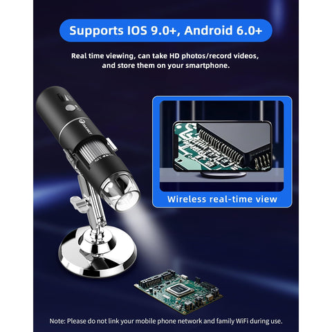 - 【Wifi Connection for Phone】: Download the software on the user manual from your APP Store; Turn on the microscope, connect the wifi (no password) which emits from the microscope; run the app and it is easy to use. Compatible with iPhone, iPad, Samsung Galaxy, Android, Mac, Windows Computer