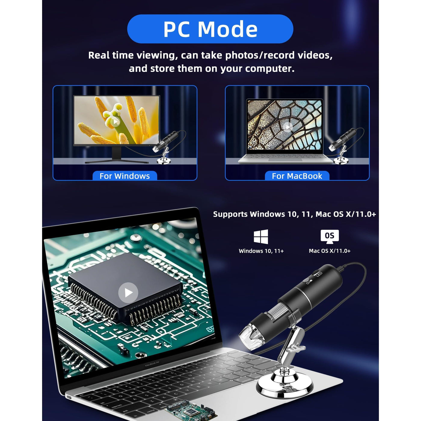 - 【App Provided】: This microscope is compatible with iPhone, Android phones, and computers, PC. Optional software for IOS, Android, Windows, MacOS X. This microscope can support Android 6.0+, iOS 9.0 or later, Windows vista/7/8/10/11 or later, MacOS X 11 or later