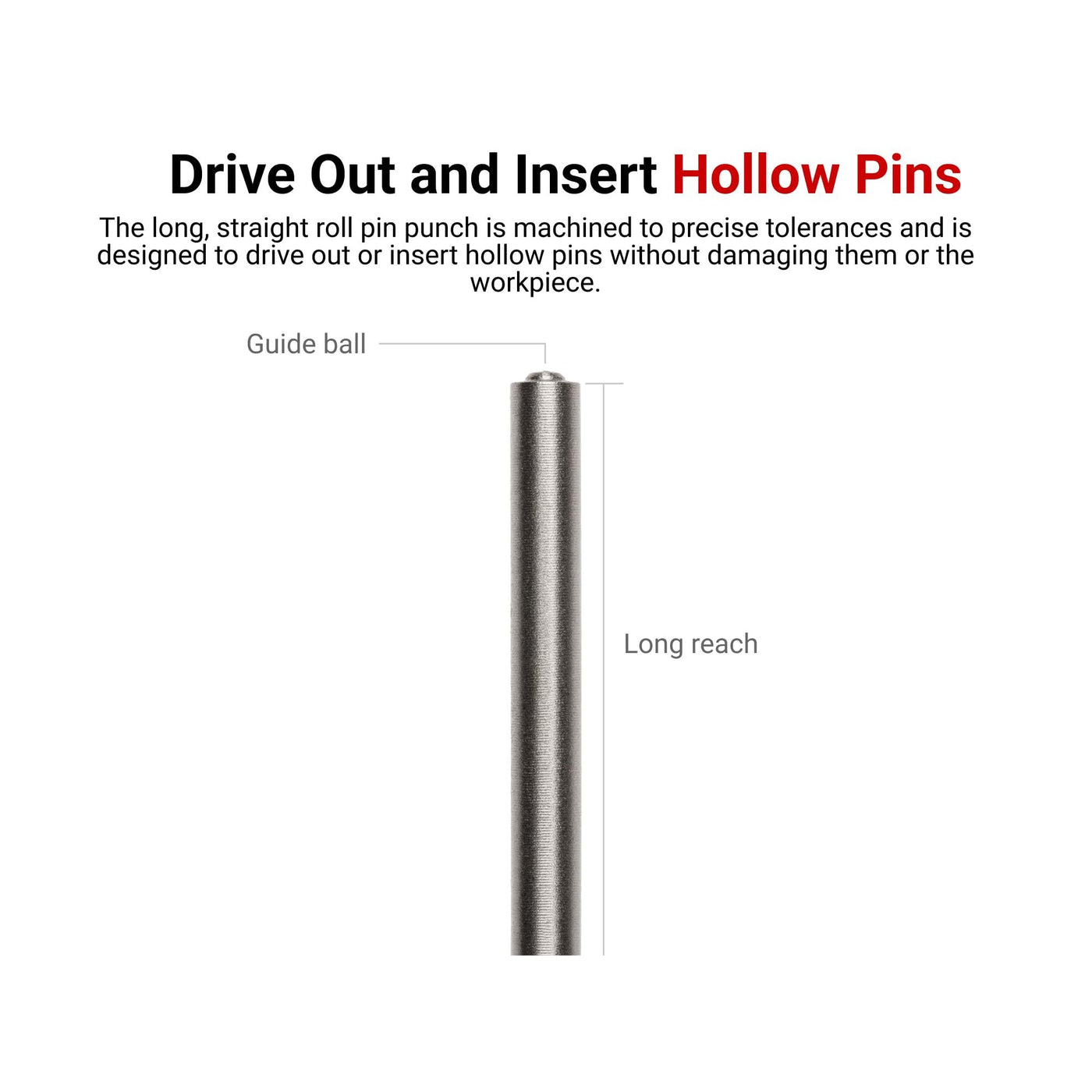 Details: Ideal for machine, small equipment, and gun service and repairs, the TEKTON 1/16 inch Roll Pin Punch smoothly drives out or inserts hollow pins or springs without deforming them. The guide ball tip self centers for perfect alignment in pin, shoulder in full, even contact with pin wall to prevent slipping or damage. Precisely machined to a reverse taper, the tip is just a bit wider than the rest of the shaft. This eliminates the possibility of it sticking in the pin hole. Made from premium, high carbon steel, each punch is individually heat treated creating a strong, hardened tip while keeping the soft temper of the striking end, allowing it to absorb hammer blows without chipping. Made in USA.