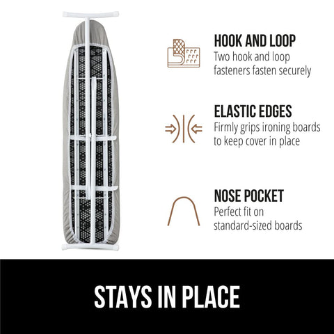 - FITS MOST BOARDS: the cover features a nose pocket design and measures 15 by 54 inches, so it’s designed to fit standard sized ironing boards; the elasticized edges create the look of a custom cover