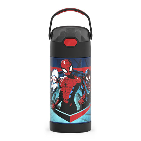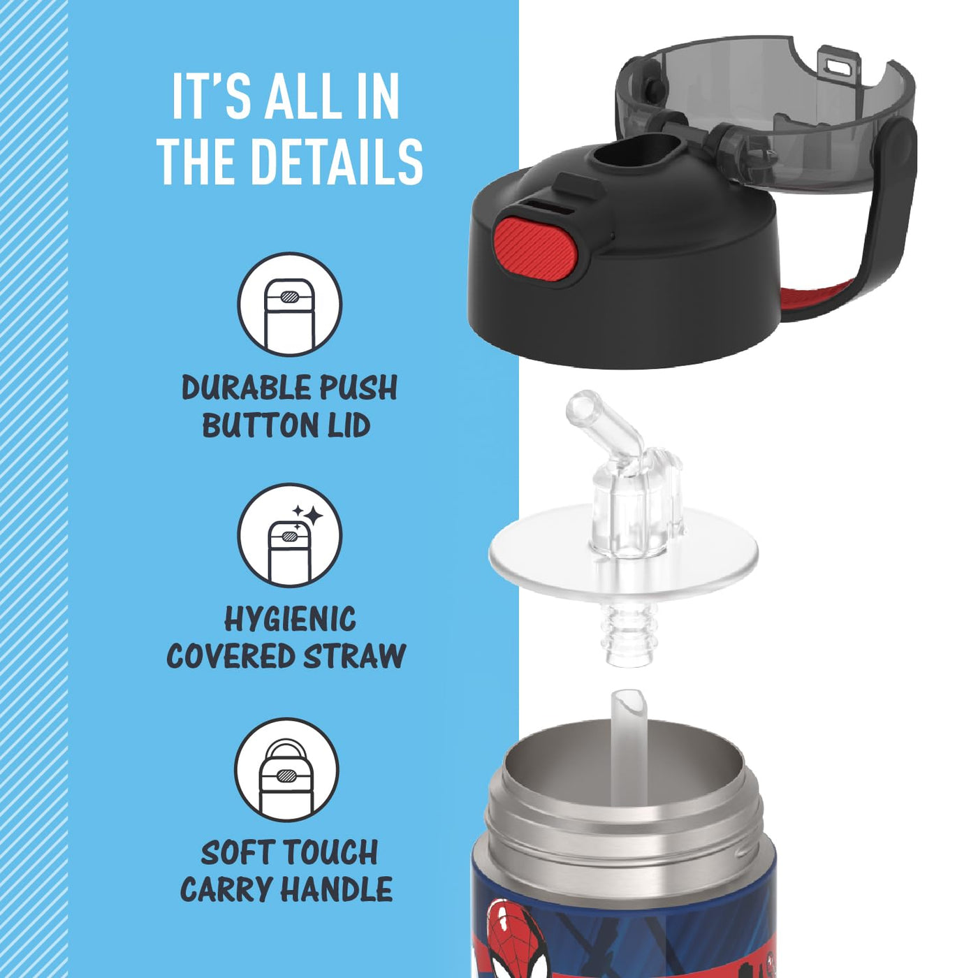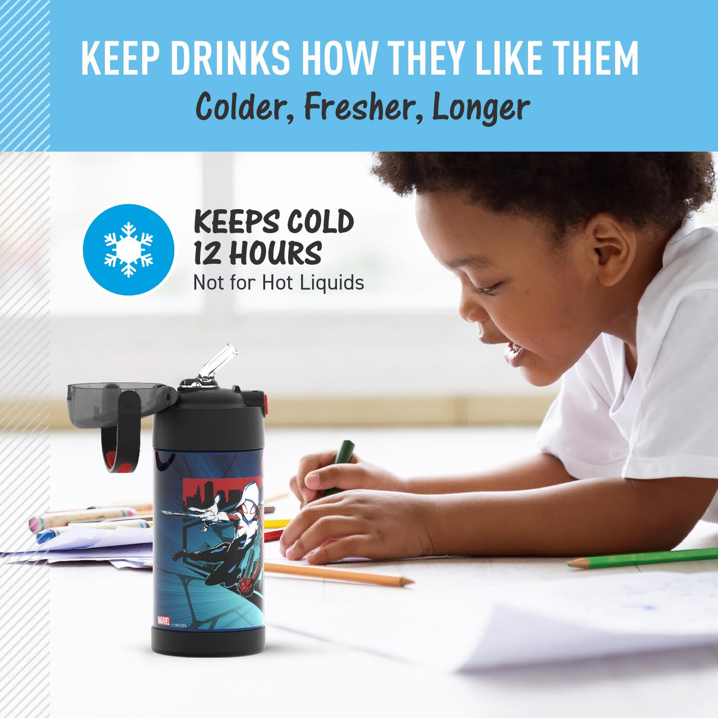 Details: The FUNtainer® 12oz Vacuum Insulated Stainless Steel Water Bottle with Straw keeps drinks cold for up to 12 hours. Our kids water bottles are built so their drinks are as cool on the inside as they look on the outside. Kids stay hydrated and parents stay happy. The double wall stainless steel construction is built to handle drops, dings and assorted roughhousing. Includes an integrated carry handle with soft-touch grip, making it easy for kids to carry with them throughout the day. Includes a hygienically covered silicone straw which is removable for easy cleaning. To clean, you can pop your FUNtainer water bottle in the dishwasher; however hand washing is recommended. Not for use with hot liquids.
