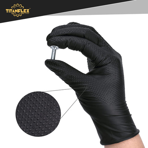 - DIAMOND TEXTURE: Fully textured fingers and palms with arrayed raised diamond patterns provide 60% more gripping power than regular nitrile gloves, yet with good dexterity for handling small objects and tools even wet or slippery.