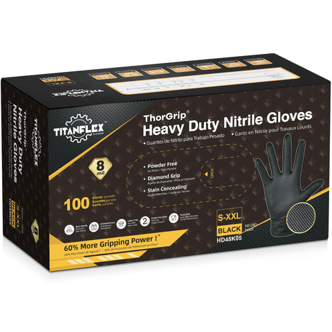 - HEAVY DUTY: TitanFlex 8-mil premium nitrile gloves are 2-3 times thicker than regular disposable nitrile gloves, and provide more puncture resistance and excellent barrier protection against grease, gasoline, and many other petroleum-based chemicals.