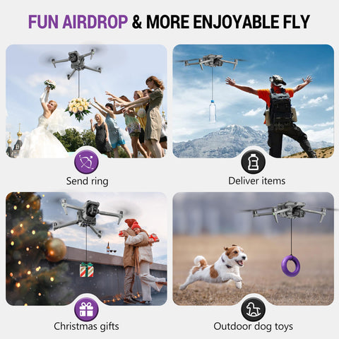 - 【Easy installation】 The strap is fixed on the device, and the device is aligned with the bottom hole of the drone and fixed. The strap goes around the top of the drone and goes through the device hole, then it is tightened and fixed. Suitable for multiple scenarios, like proposal, fishing, birthday surprise, etc.