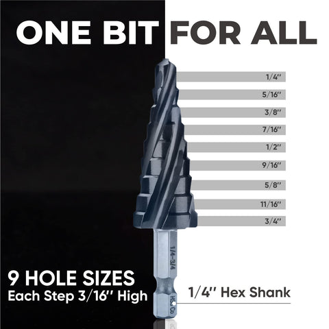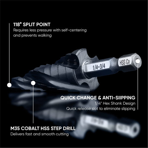 toolant Four Spiral Flute Cobalt Step Drill Bit(Pro), 1/4"-3/4" Impact Ready Unibit Step Drill Bit, 1/4" Hex Shank Step Bits for Metal, Stainless Steel, Aluminum, Plastic Sale