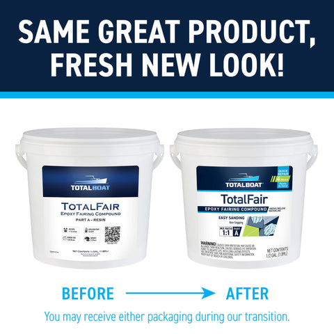 Details: Next time you get a dent or ding in your boat, don't go to the boatyard, fix it yourself with TotalBoat TotalFair epoxy fairing compound. This lightweight two-part premium marine epoxy putty is ideal for fairing, filling, and shaping, making it the perfect total boat fairing compound for repairs all over your boat. Because TotalFair bonds strongly and has a high tolerance for flexing without cracking, it's ideal for hulls, decks, keels, topsides and more. It's also great for fixing dings and dents on your car, motorcycle, or rv. This waterproof marine fairing compound can be used above or below the waterline on fiberglass, aluminum, steel, wood and cast iron. TotalFair has a simple 1 to 1 mix ratio and changes to a green color when you mix the blue and yellow components for 3-5 minutes. Its thick, creamy consistency makes this fiberglass fairing compound easy to spread, and helps it hold its shape on vertical and overhead surfaces. If you're fairing a large gouge, we recommend a 6 to 1 width to depth ratio per application. For deep/narrow areas that exceed 6 to 1, you'll need to apply TotalFair in stages, building depth with each application. At 80°F, TotalFair is ready to sand in just 3 hours to a smooth, pinhole-free surface. Be sure to wear protective gloves when mixing, and a proper respirator when sanding cured TotalFair. Do not apply gelcoat directly on cured TotalFair or the gelcoat will not cure properly. Apply TotalBoat 2-Part Epoxy Primer or TotalBoat TotalProtect Barrier Coat before applying gelcoat. Compare TotalFair to two-part epoxy putty products such as Interlux Watertite Epoxy Filler, Awlgrip Awlfair, System Three Quikfair, 3M premium marine filler, Pro Set, 4100 and Pettit EZ Fair. TotalFair epoxy filler is also stronger and more waterproof than a vinylester or polyester fairing compound. Store at 60-90°F. All TotalBoat products are developed for boaters, by boaters to provide great value and great results. 100% made in the USA.