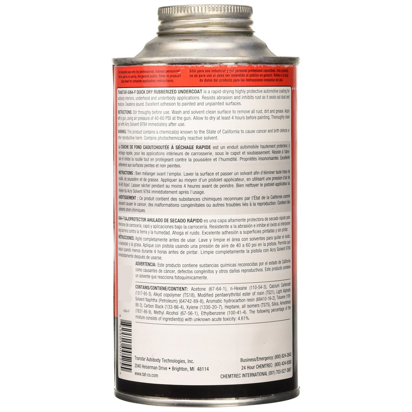 Details: ? Quick Dry Rubberized Undercoating is a premium grade, fast drying, heavy bodied, flexible undercoating with outstanding adhesion and abrasion resistance. It demonstrates excellent dry times with superior paintability that will not crack or chip. Designed for uses on all under fender/underbody applications as well as truck interiors, deck llids, and under hoods. ? Size: Quart ? Case/Qty: 6 ? Package V.O.C: 4.20#/Gal (502g/l) ? Color: Black ? Shelf Life:1 year