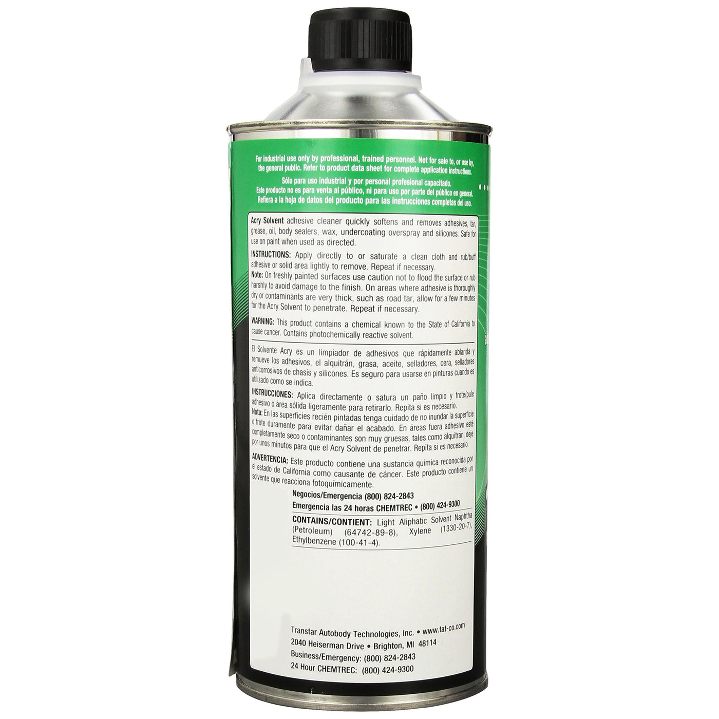 Details: Transtar 9784 Acry Solvent Adhesive Cleaner (1 Quart) will quickly soften and remove adhesives, tar, grease, oil, body sealants, wax, undercoat overspray, and silicones without leaving residue. Cleans by softening and removing product from automotive finishes. Safe for use on all automotive finishes. Does not leave residue. Do not rub harshly or flood surface when using. Apply and wipe off with a clean, dry towel. Warning: This product can expose you to chemicals which is [are] known to the State of California to cause cancer and birth defects or other reproductive harm.