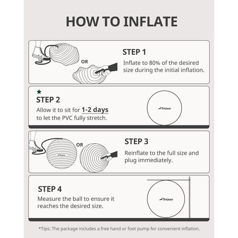 - EASY INFLATION- Trideer exercise ball comes with a quick inflation pump (45/55/65cm equipped with a hand pump; 75/85cm equipped with a foot pump), 2 air stoppers, and detailed instructions; available in 5 sizes to meet all your needs.