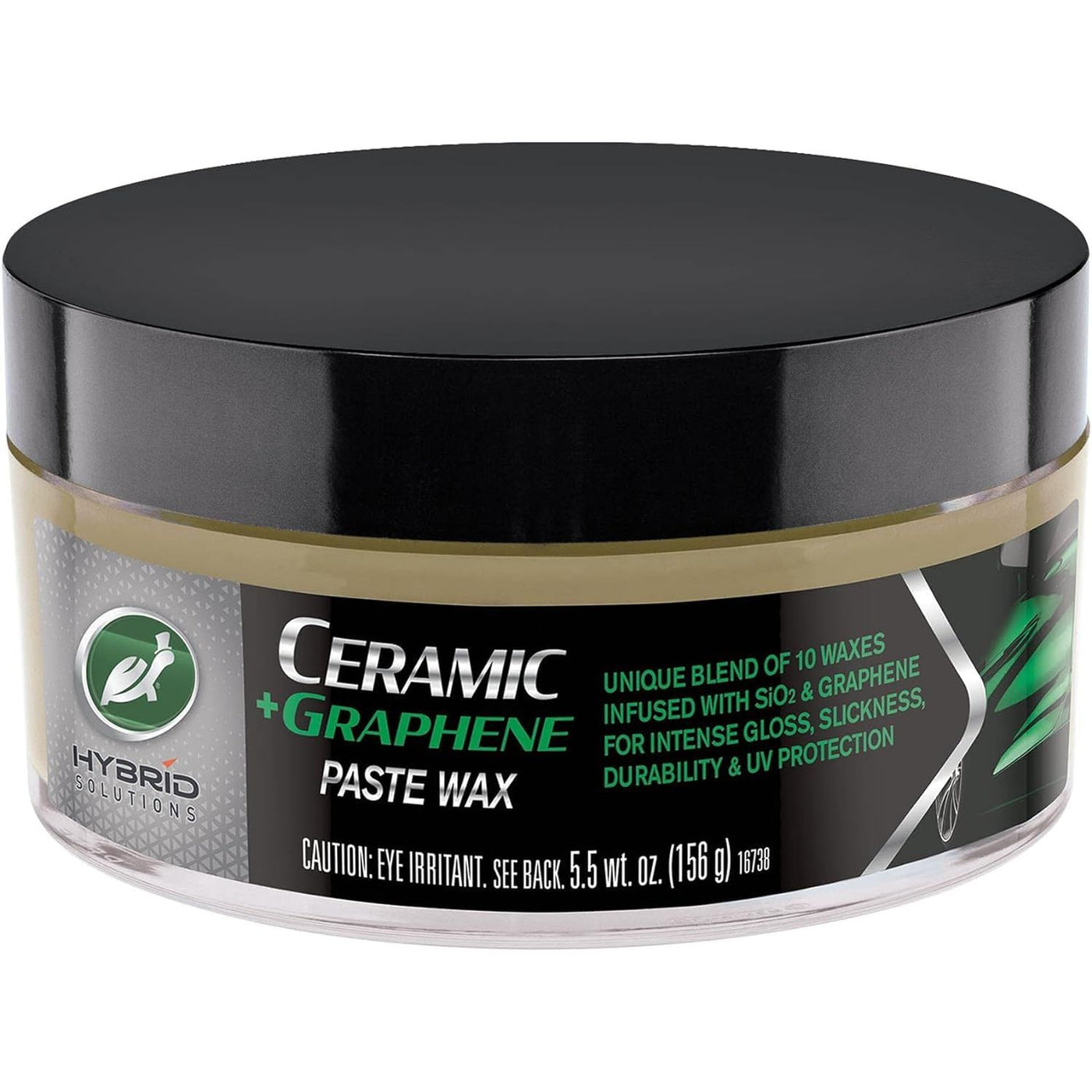 Details: Introducing the all-new Turtle Wax Ceramic + patent-pending Graphene Paste Wax. The Turtle Wax experts have put 75 years worth of expertise into one wax. The unsurpassed technology competes with the best paste waxes around at a reasonable price. Formulated with a unique blend of 10 waxes infused with Ceramic (SiO2) and patent-pending Graphene. The combined benefits include incredible gloss, slickness, water repellency, chemical resistance along with heat dissipation for increased UV protection. This helps keep water and contaminants from sticking to the vehicle resulting in a clean, protected, and easier to maintain finish. Unlike most paste waxes it goes on smooth and wipes off easily.