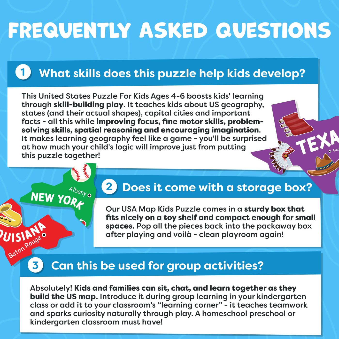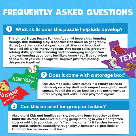 - Educational Puzzle to Help Kids Learn Geography Quickly. Our matching kid puzzles have large pieces that accurately match the shape of each state & showcase interesting landmarks in different locations. With clear, colorful illustrations to learn all 50 states, capitals & landscapes.Teach what makes our great nation so interesting with fun puzzles for kids ages 6-8 & toddlers!