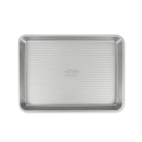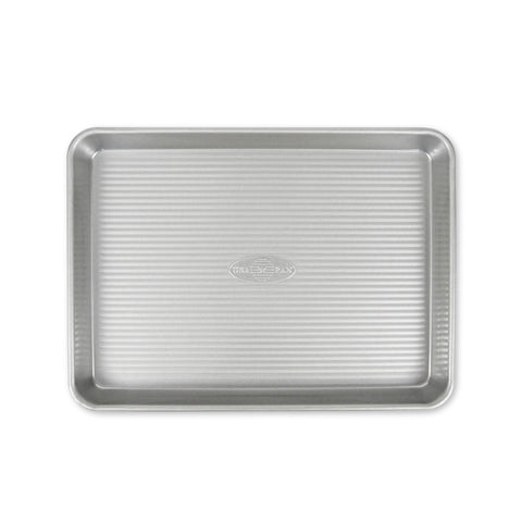 Details: The USA Pan Quarter Sheet Pan is made in the USA from globally sourced materials by a family owned and operated business. The quarter sheet is like a half sheet junior and is perfect for smaller jobs, toaster ovens (be sure to measure so it fits!), roasting veggies, splitting up sheet cakes and every day quick jobs (how about in the rv or a smaller kitchen!). Our baking sheet pans feature a unique corrugated surface which provides air circulation all around for better browning, more even baking and super easy release. The ¼ sheet pan is finished with USA Pan’s proprietary AMERICOAT nonstick coating, a nonstick silicone - which allows easy release of baked goods from the pan and makes clean up a breeze. USA Pan bakeware is made with aluminized steel, the material of choice for commercial bakeries. Steel for maximum strength and long term durability and aluminum for superior heat conductivity. Our sheet pans are finished with a steel wire in the rim, which provides extra strength and further resistance to warping. Do not exceed 450°F (230°C). Please note, our bakeware conducts heat efficiently, which may require you to reduce the time and temperature as necessary. Hand wash nonstick bakeware in warm water with mild dishwashing soap using a sponge, rinse and dry thoroughly. We recommend using only silicone, nylon or wooden utensils. Do not use sharp metal utensils. Proudly made in the USA from globally sourced materials. USA Pan is a Bundy Family owned company, based in the Greater Pittsburgh, Pennsylvania area that has been producing high performance bakeware for over 60 years.