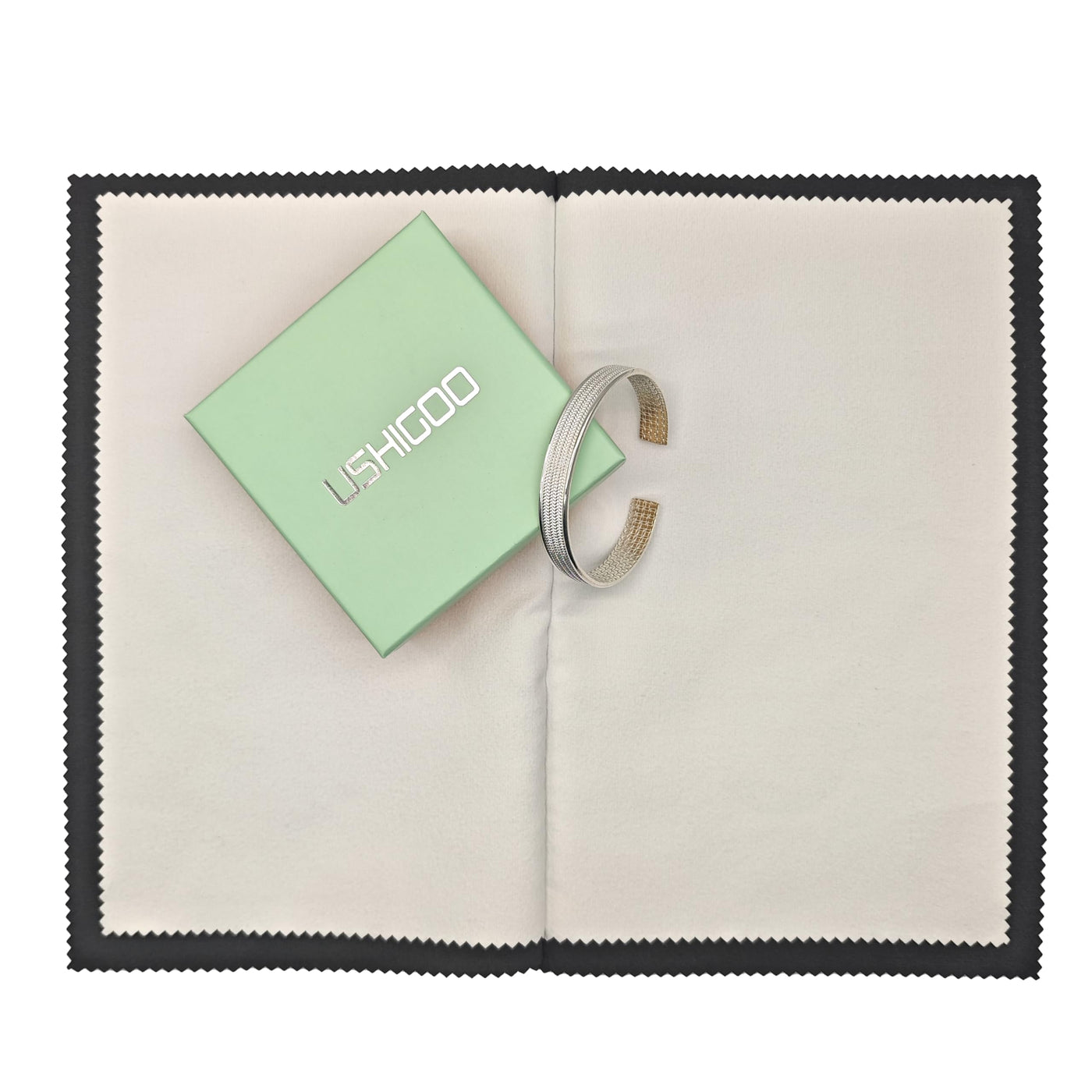 Details: Why do jewelry pieces turn dark or tarnish? Jewelry surfaces darken due to oxidation, moisture, sweat, or cosmetic residue—especially silver. USHIGOO jewelry polishing cloth uses micro-fine polishing layer technology to gently remove tarnish and restore shine without liquid cleaners, ideal for daily care. What materials can the USHIGOO polishing cloth clean? USHIGOO is suitable for silver, gold, platinum, stainless steel, copper, and brass jewelry. For delicate materials such as pearls, corals, and gemstones, only use a soft outer layer to avoid damage. At the same time, it can also clean and polish metal products such as watches How is USHIGOO different from regular silver polishing cloths? USHIGOO silver polishing cloth has a variety of styles, suitable for jewelry of different sizes and suitable for different scenes. It does not contain chemicals, is safe for sensitive skin, does not lint, and does not fade. Small-sized(3x3”) jewelry cleaning cloth is suitable for small jewelry and small-scale cleaning, and is also easy to carry. Medium-sized(6x6”) jewelry cleaning cloth is more suitable for polishing and suitable for medium and large jewelry. Large-sized(9.8x12”) jewelry cleaning cloth, with a 4-layer design, has better cleaning and polishing effects, and is more suitable for jewelry lovers or jewelry. How do I properly use the polishing cloth to clean jewelry? Use the soft outer layer to remove dust, then gently rub tarnished areas with the inner layer in a circular motion. Do not wash the cloth. Fold and store after each use to maintain effectiveness. Can USHIGOO cloth be reused? How long does it last? Yes. USHIGOO is widely used in jewelry repair shops and manufacturing. We offer wholesale, OEM services, and custom packaging. Is USHIGOO suitable for bulk/professional use in repair or manufacturing? Yes, it’s normal. The darkening shows tarnish removal in action. Avoid washing the cloth to preserve its polishing ability. Is it normal for the cloth to turn black after use? Yes, it’s normal. The darkening shows tarnish removal in action. Avoid washing the cloth to preserve its polishing ability. Is your product safe? USHIGOO has a 15 year history in the jewelry industry, and its polishing cloth products have been used by millions of users. They are allergen free and safe for daily use, even for sensitive skin. How can jewelry users keep their pieces shiny for longer? Wipe jewelry weekly with USHIGOO cloth. Avoid water, perfume, and acids. Regular maintenance helps preserve shine and reduces the need for deep cleaning.