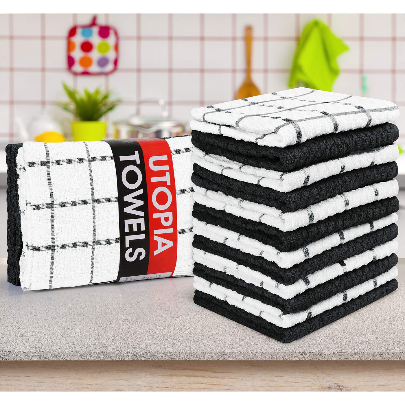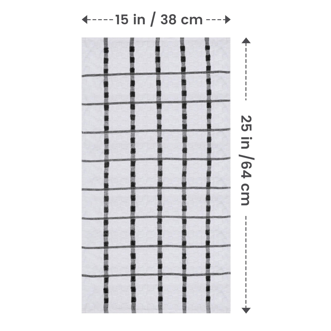 - Value Pack- Set includes 12 cotton dish towels with six black and six white dobby weave style kitchen towels measuring 15 x 25 inches