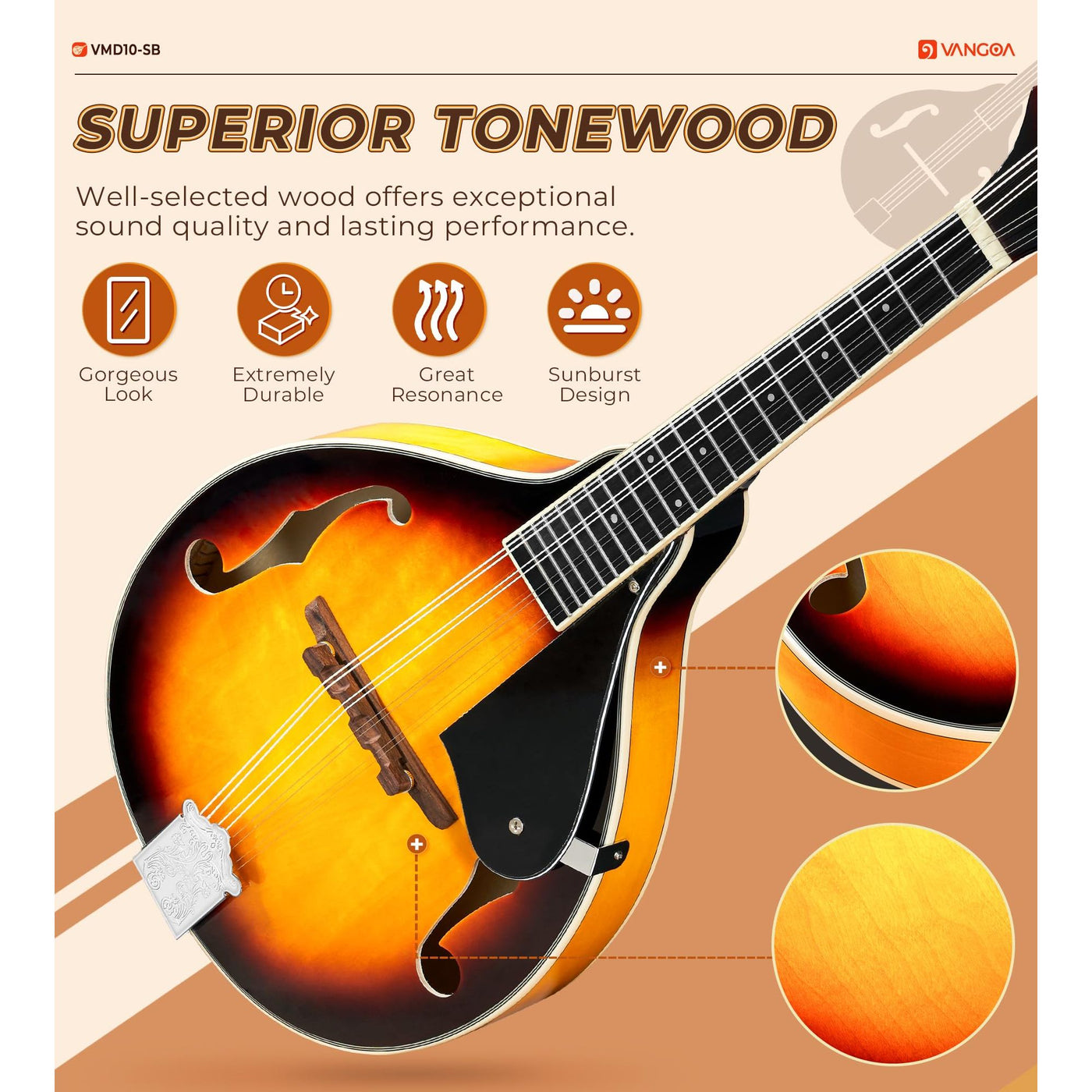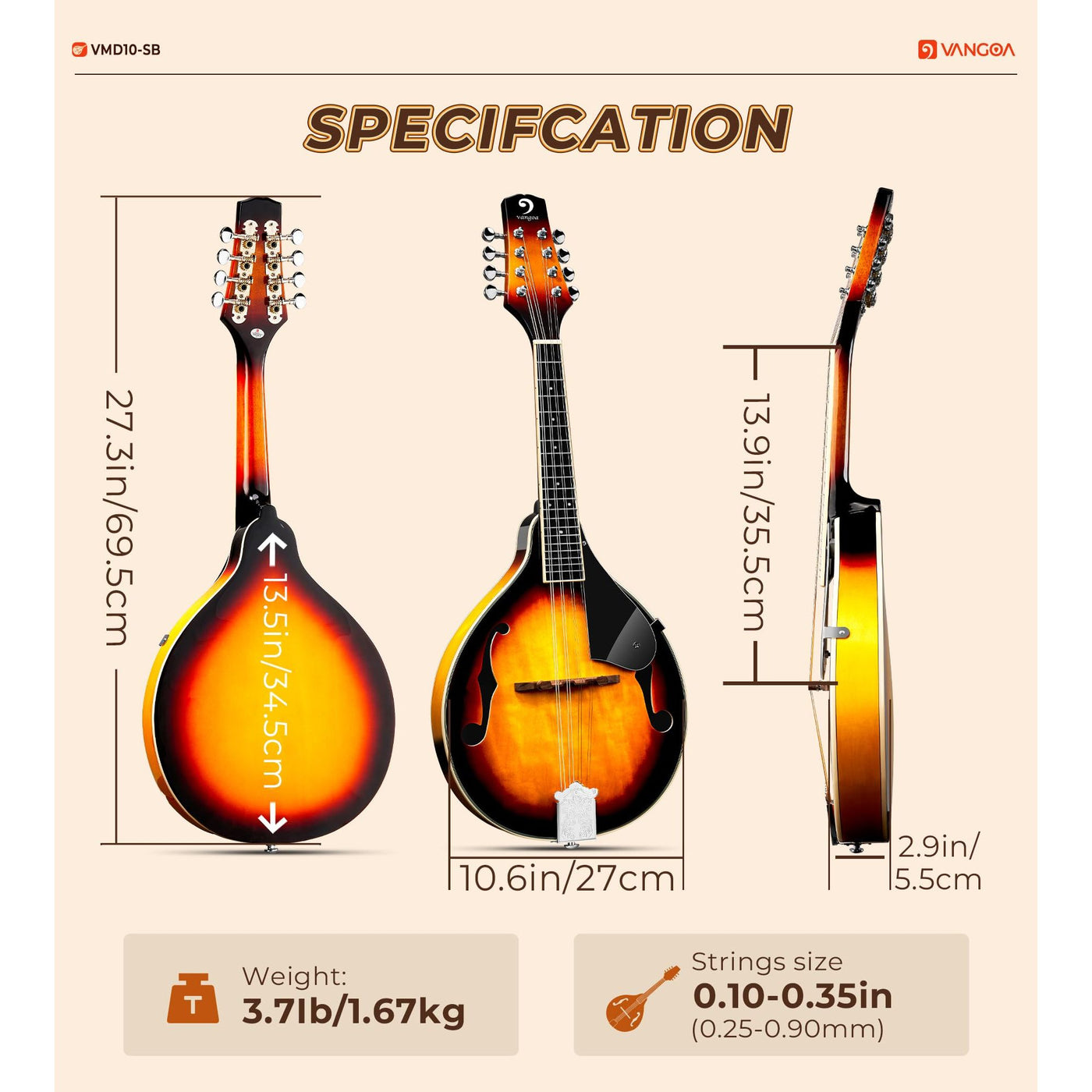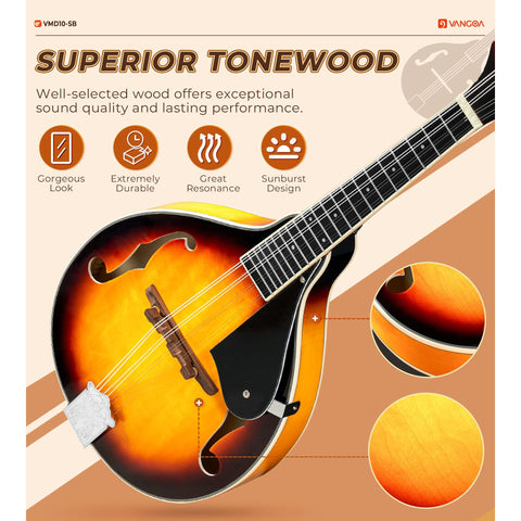 - ✔️[Premium AAA Tonewood Mandolin A-Style] Unlike mandolins made with cheap material, Vangoa mandolins are crafted from AAA-grade tone wood, delivering a rich, warm tone with outstanding resonance and depth. Perfect for players who seek superior sound quality and long-lasting durability. A-style mandolin is also a good selection either a gift or the first instrument