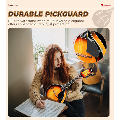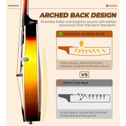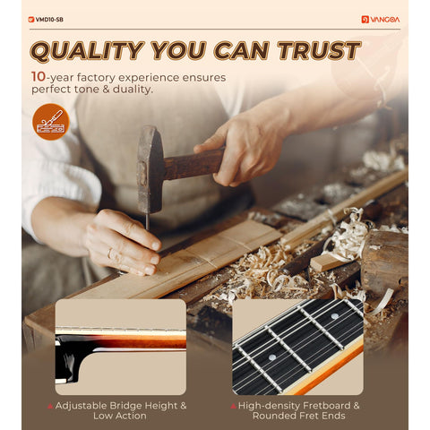 - ✔️[10 Years of Expert Craftsmanship] With over a decade of experience, Vangoa’s skilled factory produces acoustic mandolins featuring a sturdy, arched body and a smooth, durable fretboard. The high-quality adjustable walnut bridge ensures low action and optimal sound, while rounded fret ends provide a smooth, comfortable playing experience. Perfect for both beginners and seasoned players