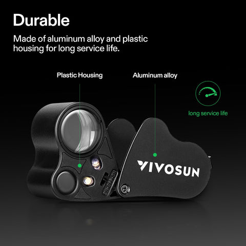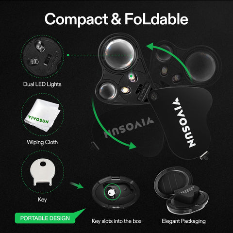 - Bright LED Lights: Built-in LED lights will illuminate your surroundings, so you can accurately examine details of plants, jewelry, stamps, maps, or whatever you’re looking at