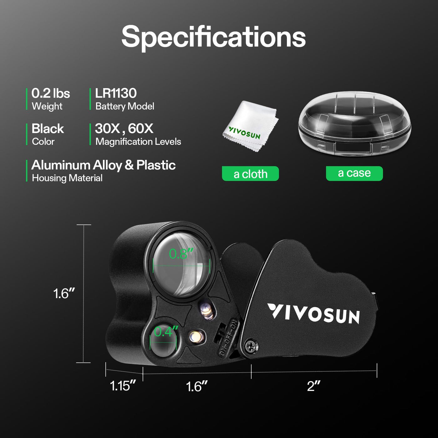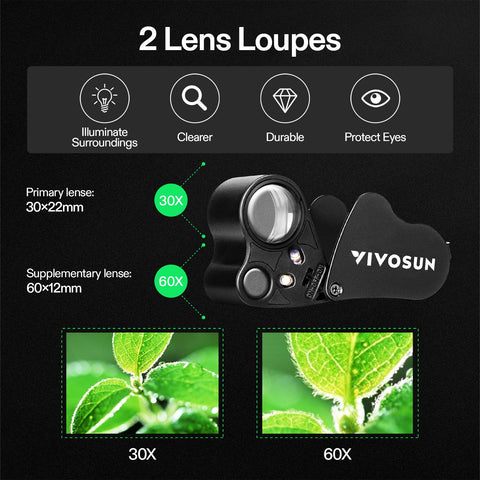 - Double Lenses: Equipped with two separate lenses for different degrees of magnification; The primary lense is 30x22mm, and the supplementary one is 60x12mm; Each lense has appropriate use