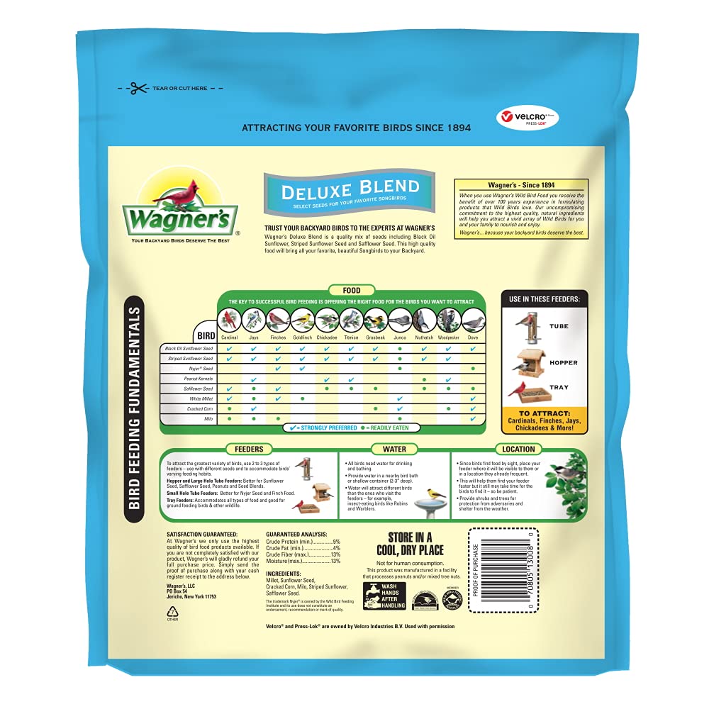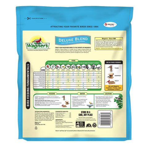 Details: Wagner’s Deluxe Wild Bird Food Blend with sunflower and general purpose seeds offers the backyard enthusiast a value plus moderately priced food that is the real deal! Deluxe Blend can be used in all types of feeders as well as being a great mix to attract those wonderful ground feeding birds. You’ll get all the regular customers like Cardinals, Chickadees and Finches as well as other indigenous backyard visitors. Trust your backyard birds to the experts at Wagner’s.