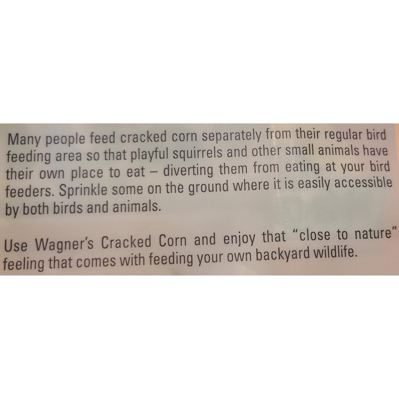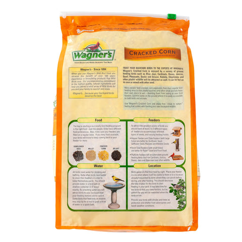 Details: Our Wagner's Cracked Corn is enjoyed by a variety of ground feeding birds such as Blue Jays, Cardinals, Doves, Juncos, Quail, Pheasants, Ducks and Grouse. Rabbits, chipmunks and other playful wildlife will be attracted as well. It can be fed on its own or mixed with other seed. Many people feed cracked corn separately from their regular bird feeding area so that playful squirrels and other small animals have their own place to eat - diverting them from eating at your bird feeders. Sprinkle some on the ground where it is easily accessible by both birds and animals. Use Wagner’s Cracked Corn and enjoy that "close to nature" feeling that comes with feeding your own backyard wildlife. Trust your backyard birds to the experts at Wagner’s.