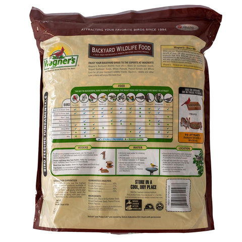 Details: Wagner's Backyard Wildlife Food is a tasty treat for squirrels, rabbits and other backyard friends. Wagner’s Backyard Wildlife Food offers black oil sunflower seeds, striped sunflower seeds, whole peanuts, peanut kernels, and whole corn for all your backyard wildlife friends. Squirrels, rabbits and other cute critters will enjoy this tasty treat. Many people feed Wagner’s Backyard Wildlife Food separately from their regular bird feeding area, in a platform feeder or sprinkled on the ground, so that playful squirrels and other small animals have their own place to eat - diverting them from the bird feeders. Use Wagner’s Backyard Wildlife food and enjoy that "close to nature" feeling that comes with feeding your own backyard wildlife. Trust your backyard birds to the experts at Wagner’s.