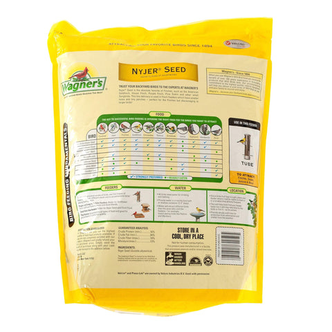 Details: Wagner's Nyjer Seed is the absolute favorite of Finches, such as the American Goldfinch, House Finch, Purple Finch, Pine Siskin and other small songbirds. This tiny delicacy is used in finch feeders which have smaller holes and tiny perches - perfect for the Finches but discouraging to larger birds. Wagner’s Nyjer Seed is the perfect choice for nurturing Finches with its high fat and protein content. Sometimes referred to as "black gold," nyjer seed may seem more expensive than some premium blends, it actually lasts longer as it packs an incredible 150,000 seeds per pound and the seeds create no waste, no mess, no growth and more visits to your feeder. Fill your Finch feeder with Wagner’s Nyjer Seed and enjoy the antics of these beautiful and sociable birds in your backyard. Trust your backyard birds to the experts at Wagner’s.