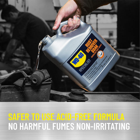 Details: A rust removing soak that safely removes tough rust from metal parts and tools. WD-40 Specialist Rust Remover Soak quickly dissolves rust and restores tools, equipment, and surfaces to bare metal without chipping, scraping or scrubbing. Great for removing rust from tools, metal, cast iron, chrome parts, and more without harming paint, gaskets, trim, or other surrounding parts. This non-toxic and biodegradable rust-removal formula does not use acids or caustic chemicals and is safe to use on most metals. To remove light rust, leave parts in the solution for 1-3 hours. To remove heavy rust, leave parts in the rust removal solution overnight. Do not use on parts that have bluing, browning or protective oxide paints, as those protective coatings would be removed. * Ideal for use on auto restoration, tractors, antiques, farm equipment & implements, trailers & hitches, and rusty tools * Non-toxic and biodegradable * NSF Category P1 (#146753)