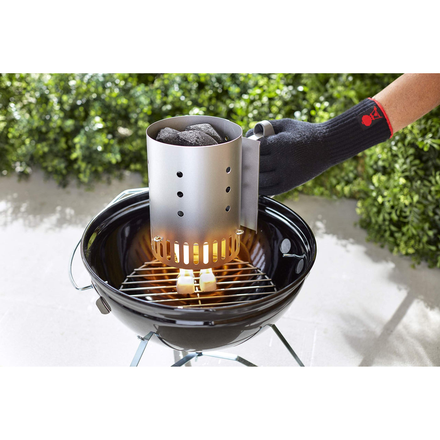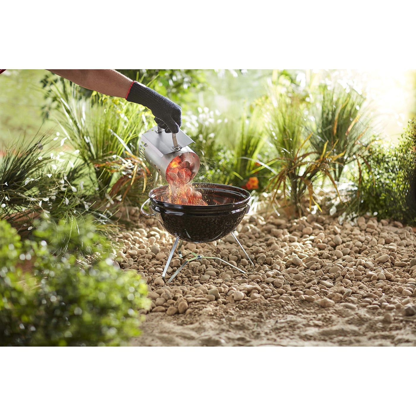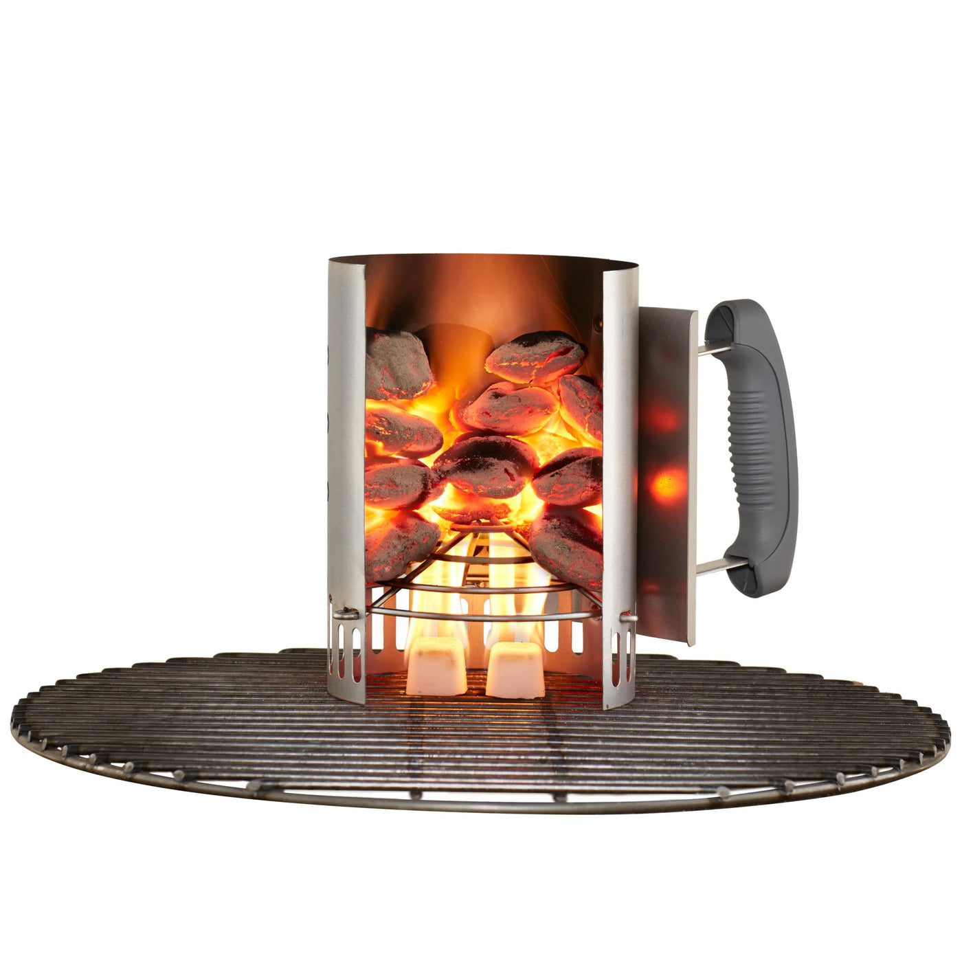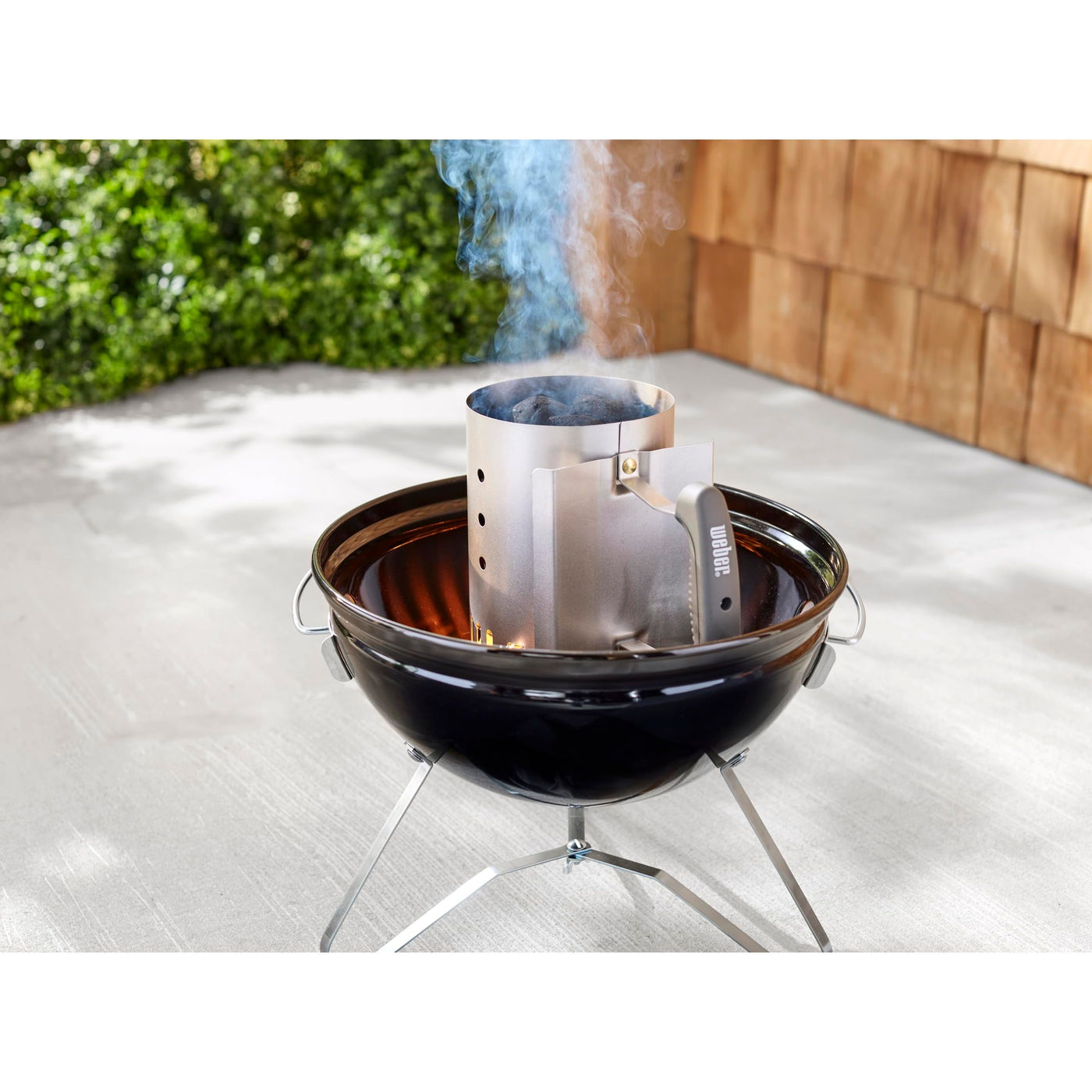 Details: This smaller version of original Rapidfire Chimney Starter lights coals in under 15 minutes without using lighter fluid. Place canister with coals on top of Weber Lighter Cubes or crumpled newspaper and light. It's that easy. Fits perfectly on Smokey Joe and Jumbo Joe charcoal grills.
