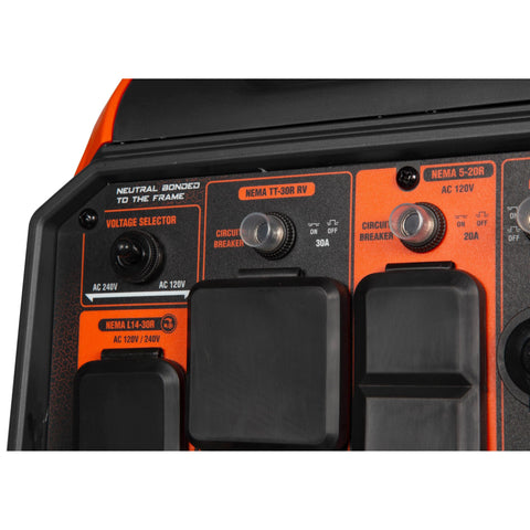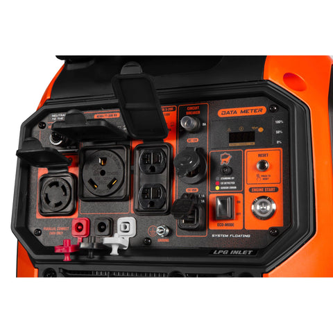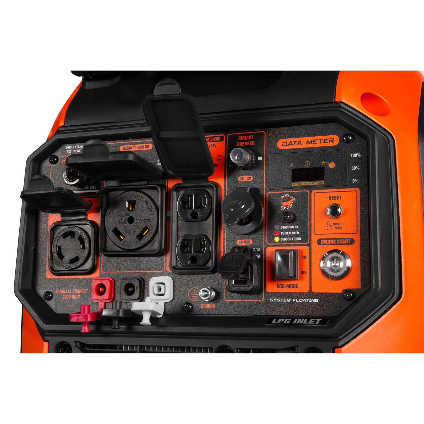 - Includes fuel shut-off to help limit maintenance, onboard wheels, a telescoping pull handle, one L14-30R 120V/240V receptacle, two three-prong 120V receptacles, one TT-30R RV receptacle, one 12V DC receptacle, two 5V USB ports, a voltage selector switch, a tool-free LPG quick-connector, a six-foot-long LPG regulator hose, and a three-year warranty