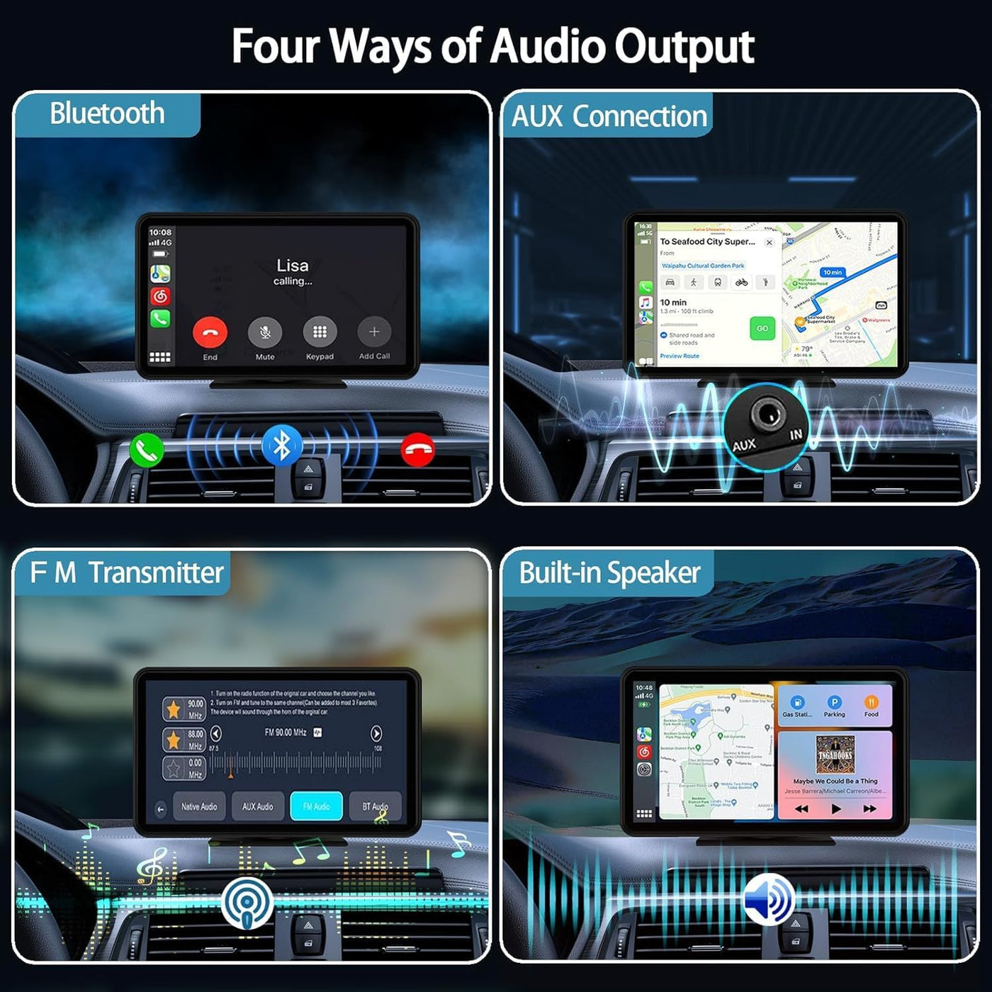 - 【Multiple Audio Output Modes】The portable carplay screen has Bluetooth/built-in speakers, AUX and FM transmitter audio output options. You can use Bluetooth connection to have the sound play by built-in speaker of the carplay stereo, realize Bluetooth speakerphone calls and music playback. You can also play audio through the car's original sound system via the AUX and FM radio options. Freely select radio stations, listen to real-time radio, weather forecast, news.
