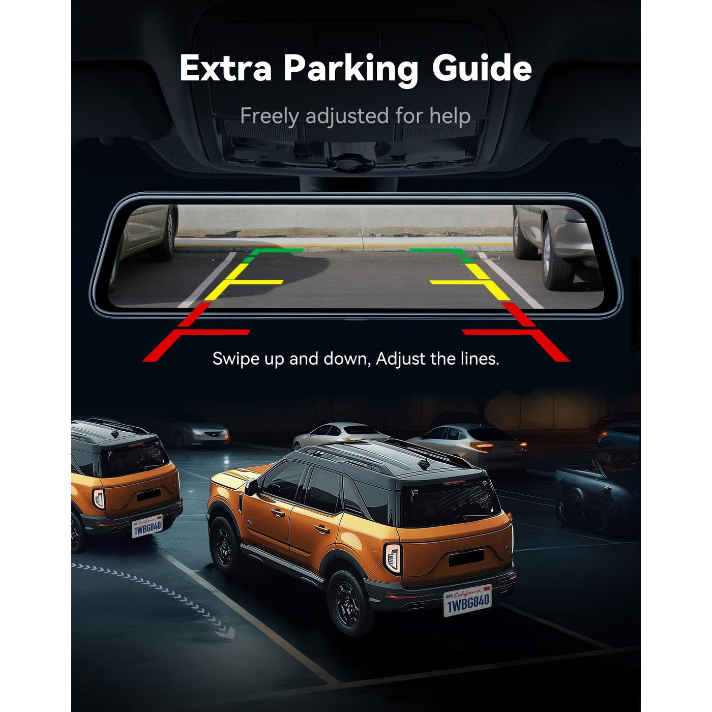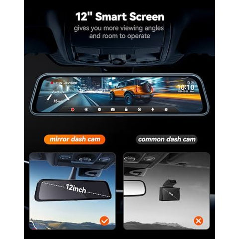 - UPGRADED 4K UHD CLARITY - Experience stunning detail with the front camera's upgrade to 4K UHD (2160p) resolution, paired with a 1080p rear camera. The extra-large 12" display provides 1.5 times the viewing area of a standard mirror, significantly reducing blind spots for enhanced safety.