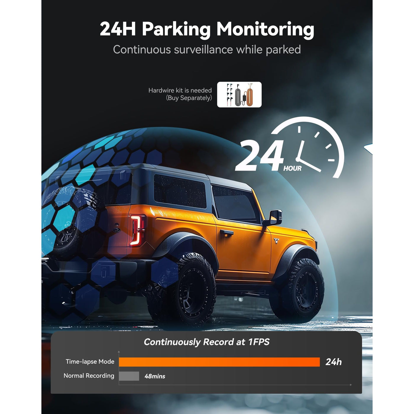 - 24-HOUR PARKING MONITOR - Beyond on-the-road safety with loop recording, the WOLFBOX camera also features a 24-hour parking monitor. Time-lapse mode records at a low frame rate to conserve power and storage while ensuring continuous surveillance of your vehicle. (A hardwire kit is required for parking monitoring.)