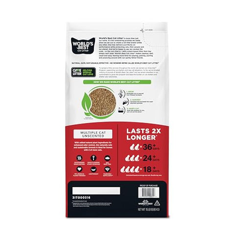 Details: Made with a natural plant ingredient for even more outstanding odor control, this multiple cat clumping litter is easy to scoop and proven flushable for simple cleanup! Having more than one cat shouldn’t mean you have more to worry about it. Your cats deserve the best clumping cat litter.Directions: 1. TRANSITION SLOWLY: Start with only a third of World's Best Cat Litter added to a clean box of your current litter. Then, once your cat is more familiar with it, change to two-thirds. After that, use only World's Best Cat Litter. 2. PICK A GOOD LOCATION: Provide at least one litter box per cat. Place the box in a quiet place that can be easily accessed and is away from the cat's food and water dishes. 3. KEEP IT CLEAN: For best results, scoop clumps daily and maintain a depth of 2-3 inches of World's Best Cat Litter.