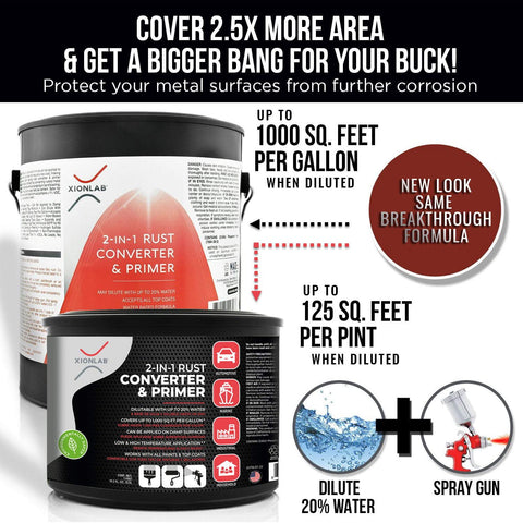 - COVER 4X MORE AREA & GET A BIGGER BANG FOR YOUR BUCK! Our rust neutralizer will cover up to 1000 square feet per gallon, and up to 125 sq. ft. per pint, so you can protect your metal surfaces from further corrosion. You can dilute it with 20% water and use a spray gun to apply this one-step rust treatment solution to all your rusty metallic surfaces with ZERO EFFORT!